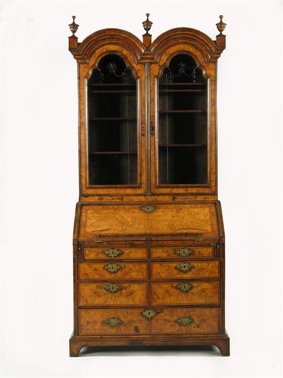 A George I bureau cabinet, the double domed top with arched bevelled and engraved glass panels, previously mirrored, to adjustable shelves above a pair of candleslides, the fall with a rest to a stepped interior with concave drawers, above six short and one long drawer, all fitted later handles, 89in (226cm) h, 42in (107cm) w, 24.75in (63cm) d. Old restoration.