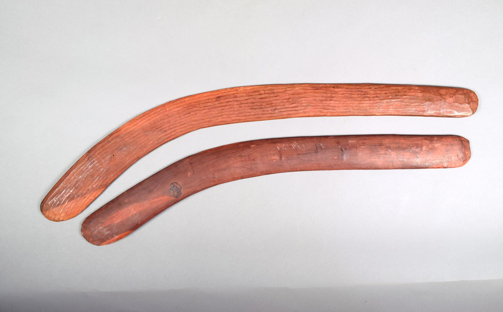 An Aboriginal boomerang, one side with shallow fluting, the grip and back plain, red ochre, 75cm long and an Aborigine boomerang with red ochre finish, 66.5cm long. (2)