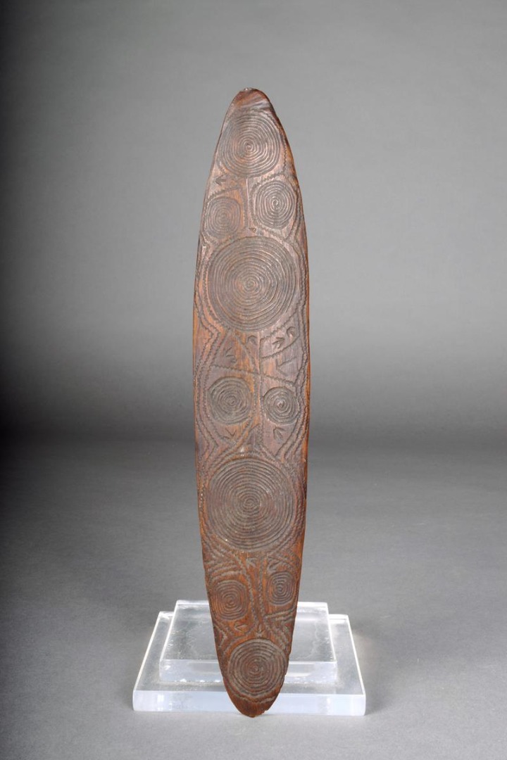 An Aboriginal churinga, wood of eliptical shape with one side domed, both decorated spirals, emu footprints and a weapon, divided by jagged lines, 26.5cm long.