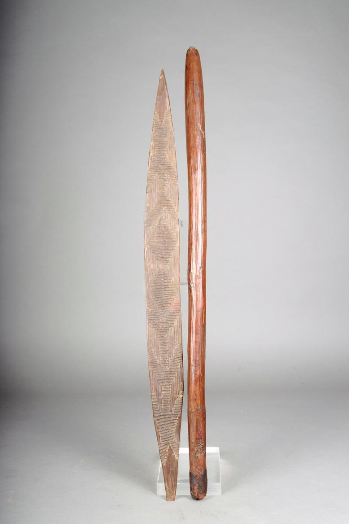 An Aboriginal Churinga, Western Desert, with carved linear decoration, 65cm long and an Aboriginal digging stick, Central Desert, with fine grooves and decorated handle with gum tip, 69cm long. (2)