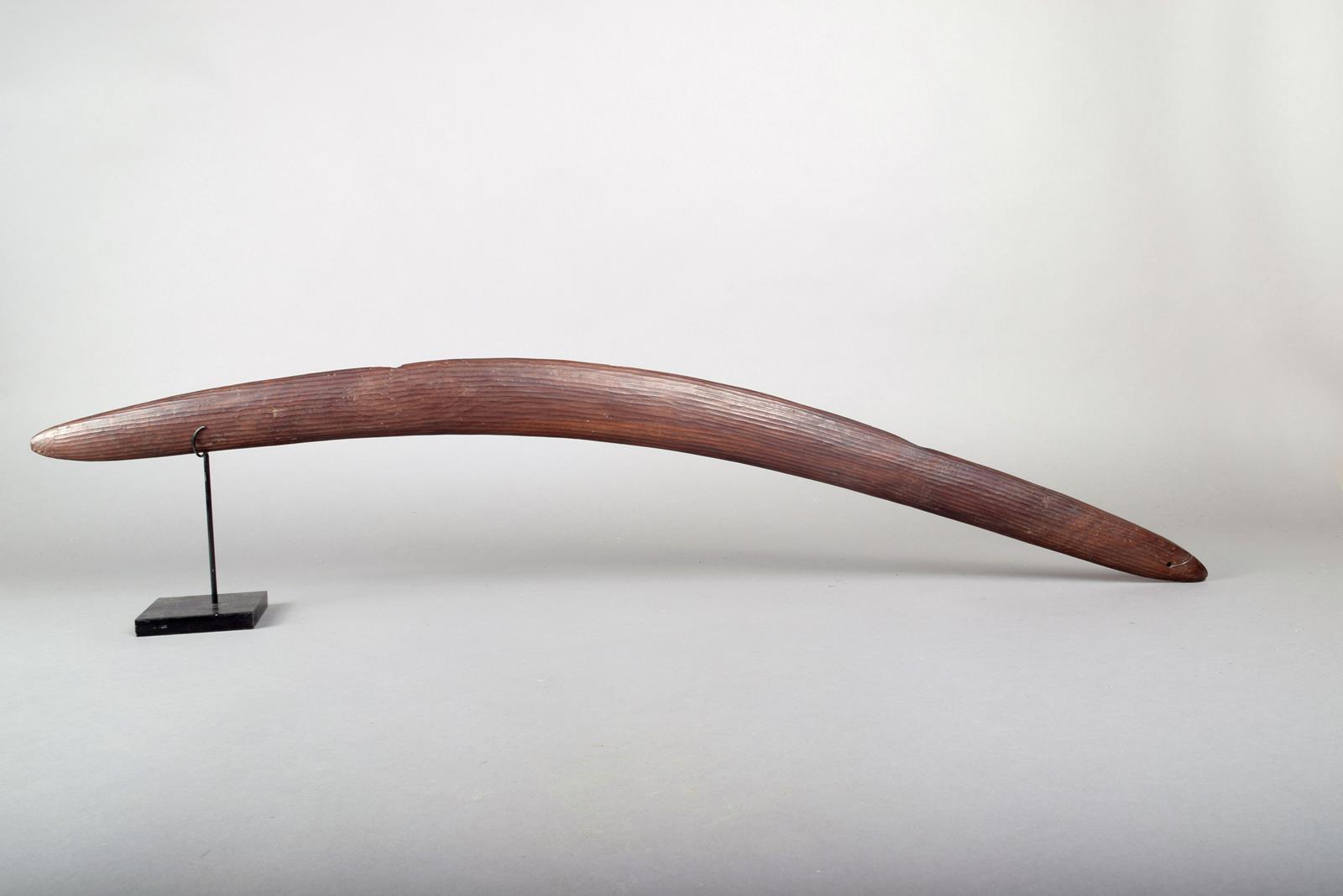 An Aboriginal boomerang, of slender curved form with incised linear decoration to the front with plain tips, the reverse with a textured finish, one end pierced, the reverse with inscribed inventory mark ST 001, 87cm long, with stand. (2)