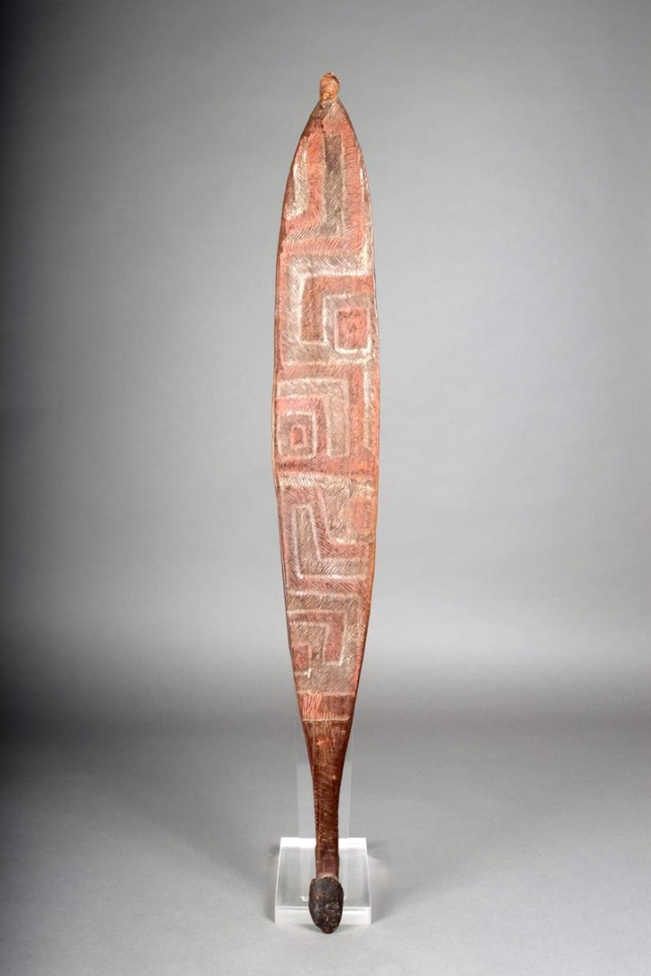 An Aboriginal woomera, spear thrower, with incised linear decoration, with ochre and white pigment, with fibre bound point and gum covered handle, 84.5cm long.