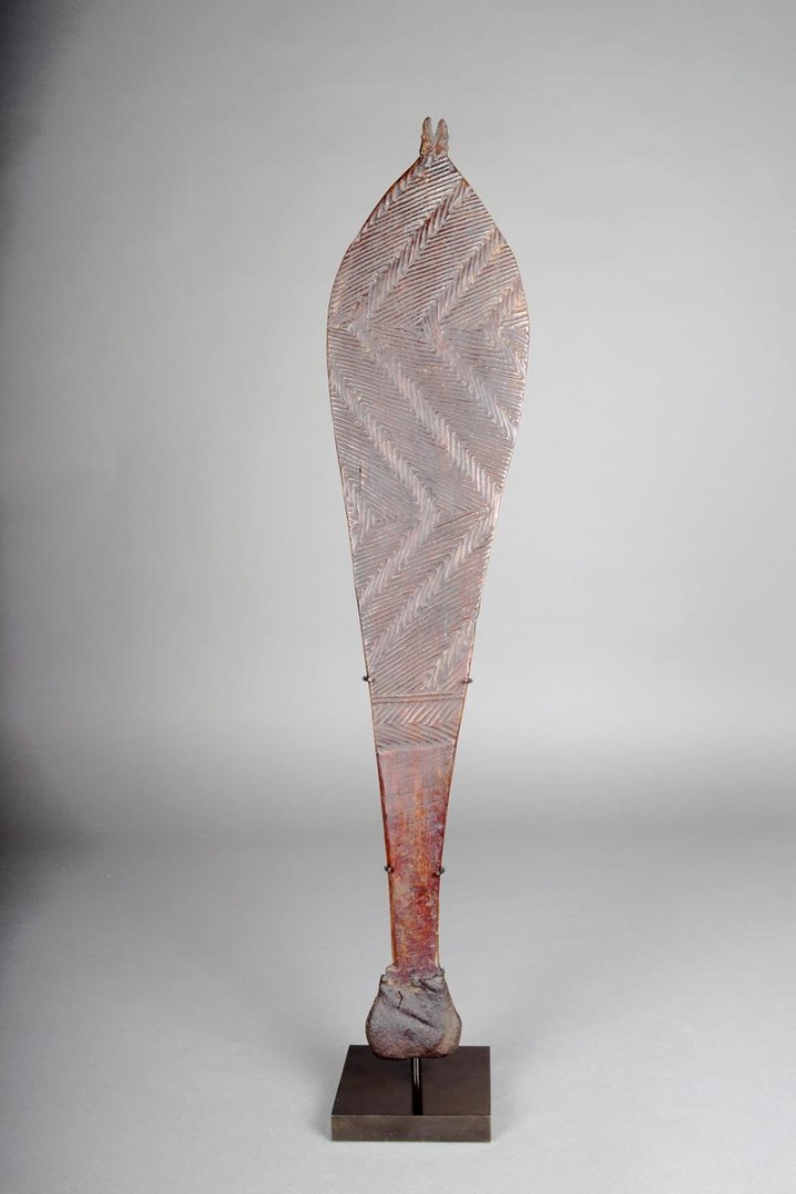 An Aboriginal spear thrower, wood with carved linear decoration and gum to the handle, one outside edge with notches, 60.5cm long, on a stand. (2)