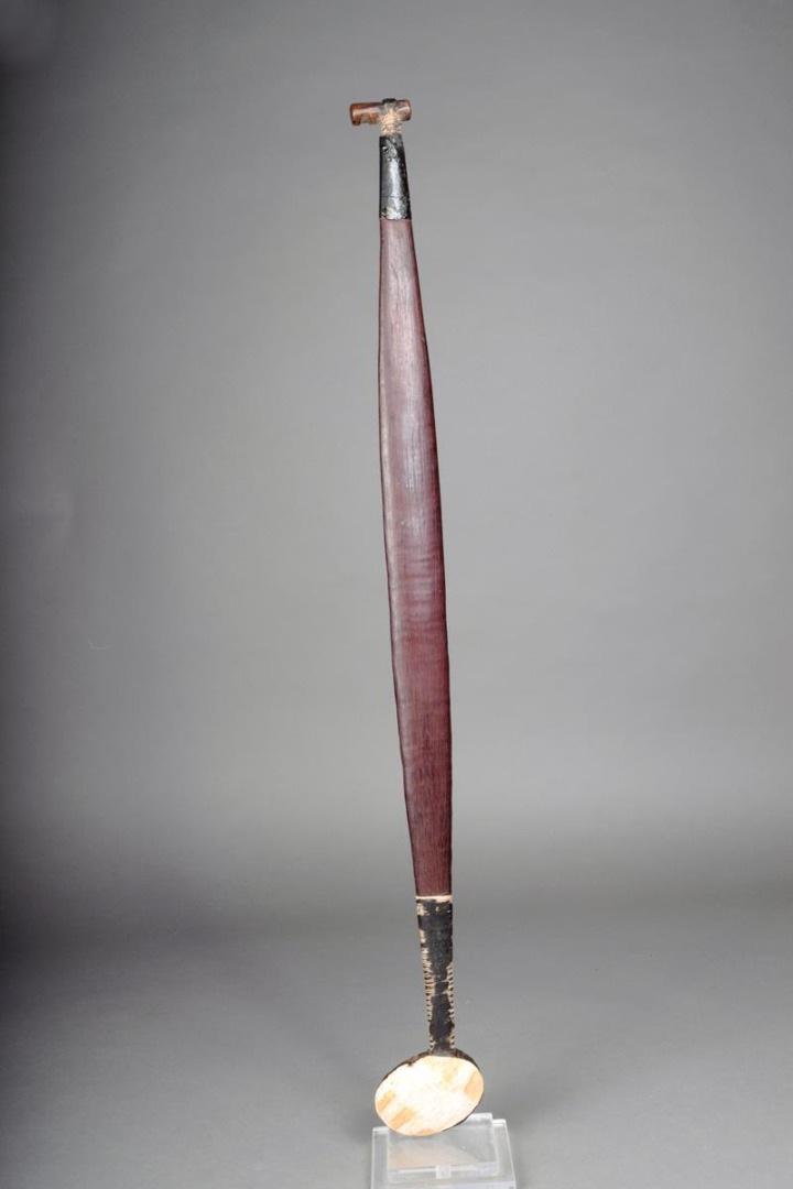 An Aboriginal spear thrower, Cape York, North Queensland, wood, shell, fibre and resin, 73.5cm long.