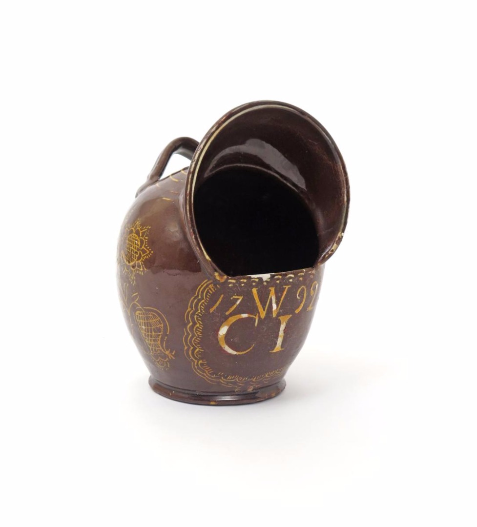 A large slipware salt pig dated 1792, the generous body with a wide hooded opening, decorated in cream slip on a treacle ground with large floral sprays, beneath the opening inscribed '1792 WCI', a little retouching to the glaze, 26cm high.