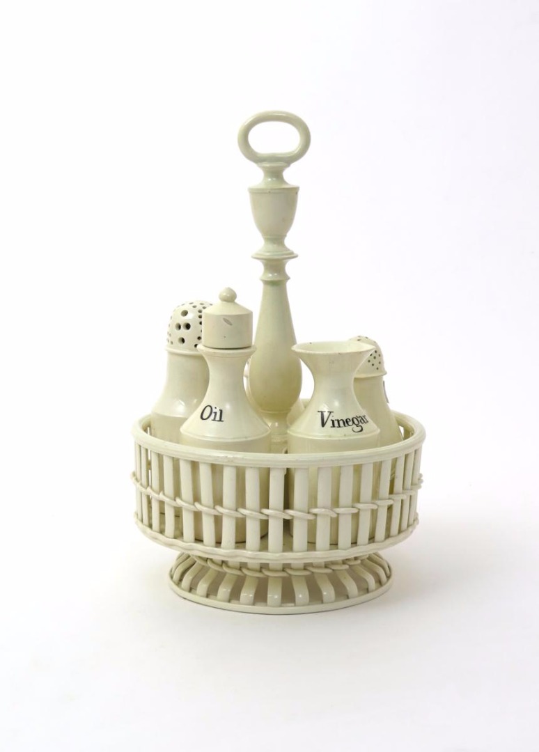 A creamware cruet or condiment stand late 18th century, the circular stand with vertical slats interwoven with narrow clay ribbons, set with five compartments containing a vinegar bottle, oil bottle and cover, and one large and two small casters, some restoration, 31cm overall. (7)