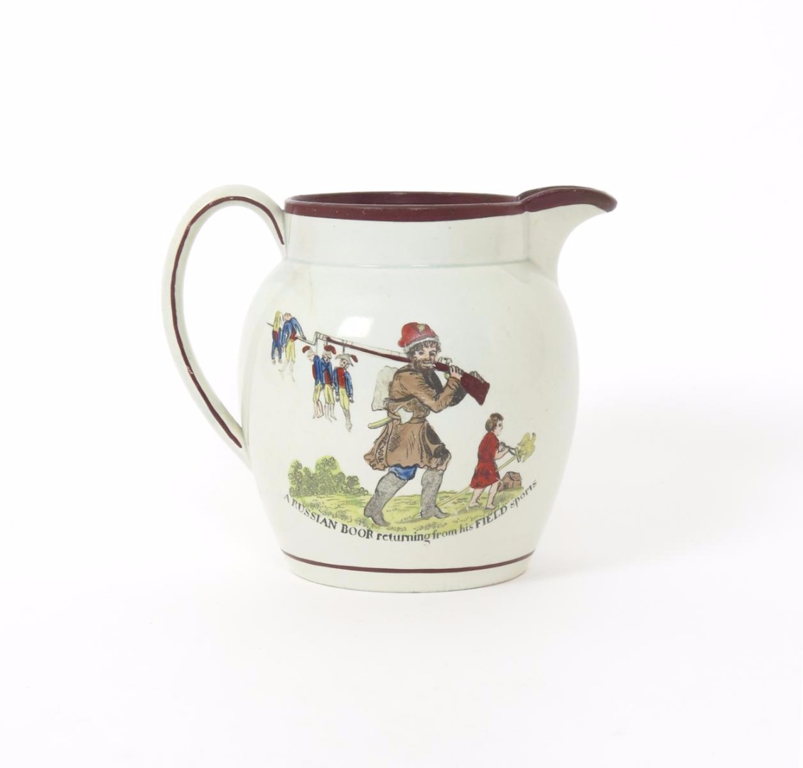 A rare pearlware Napoleonic jug c.1813, printed and hand-coloured to one side with a Russian soldier holding a rifle over his shoulder from which are suspended the corpses of five Frenchmen, titled 'A Russian Boor returning from his Field sports', the reverse with Napoleon surrendering to a further Russian who holds an axe aloft, a short rim crack, 14.5cm.