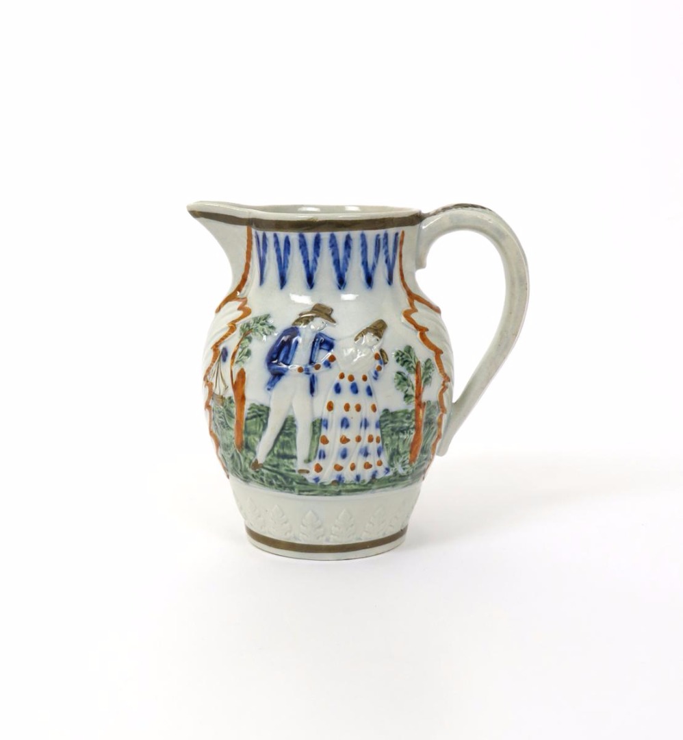 A Pratt ware jug c.1800, moulded to one side with the Sailor's Farewell, the reverse with the Sailor's Return, the eponymous hero depicted with his lass, picked out in a traditional palette of blue, brown, green and ochre, between stiff leaf borders, 12.8cm high.