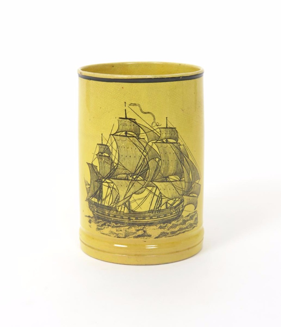 A yellow ground pearlware mug late 18th/early 19th century, decorated in black with a large ship at sail, flying a long pennant from her middle mast, minor faults, 14.5cm.