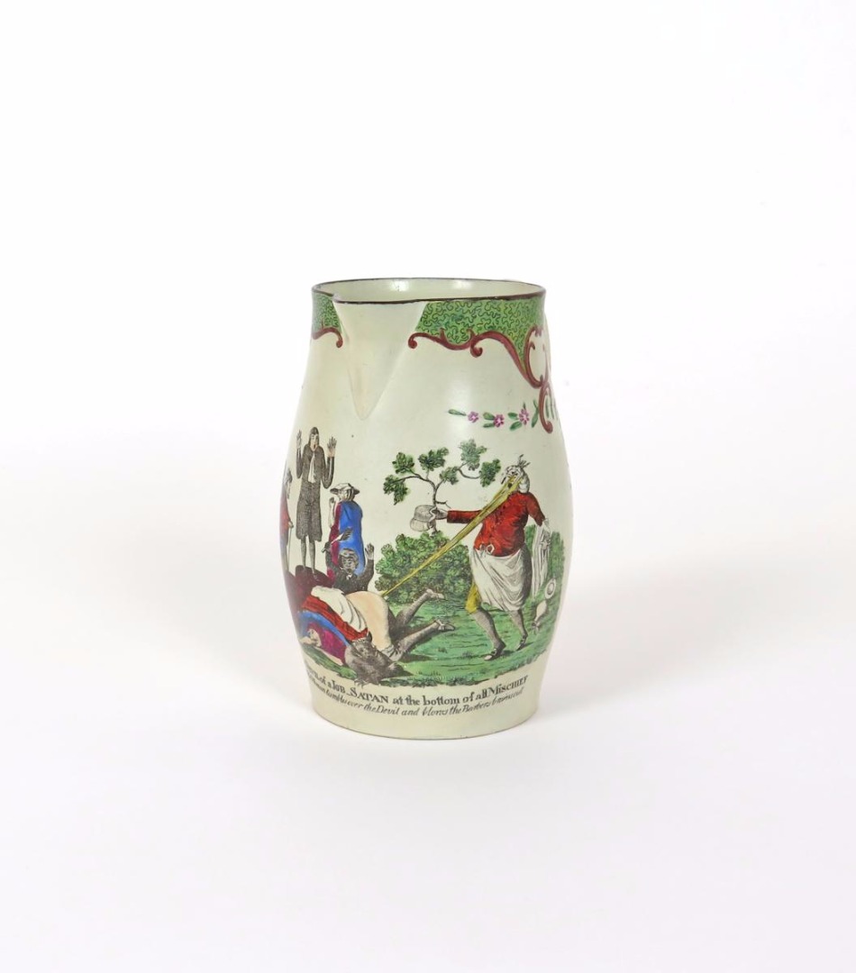 A previously unrecorded creamware satirical jug late 18th century, printed and hand-coloured with a bawdy scene of figures including a priest, a chimney sweep, a barber and an old woman with her behind exposed, titled 'The Devil of a Job - Satan at the bottom of all Mischief', the rim painted with shaped green panels simulating shagreen, and simple floral sprays, restored, 17.2cm.