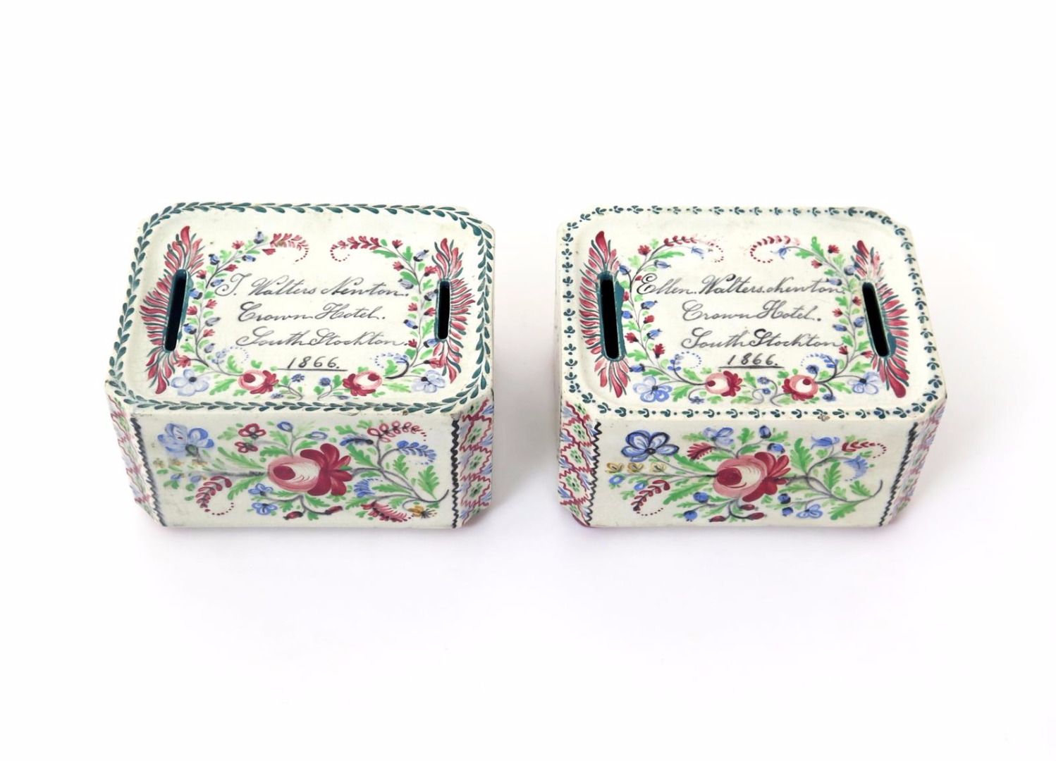 A pair of pearlware moneyboxes dated 1866, of rectangular form with chamfered corners, decorated in Portobello colours with sprays of rose and other flowers, inscribed to the tops, one for Ellen Walters Newton, the other for T Walters Newton, both 'Crown Hotel South Stockton 1866', each raised on four low feet, 13.5cm across. (2)