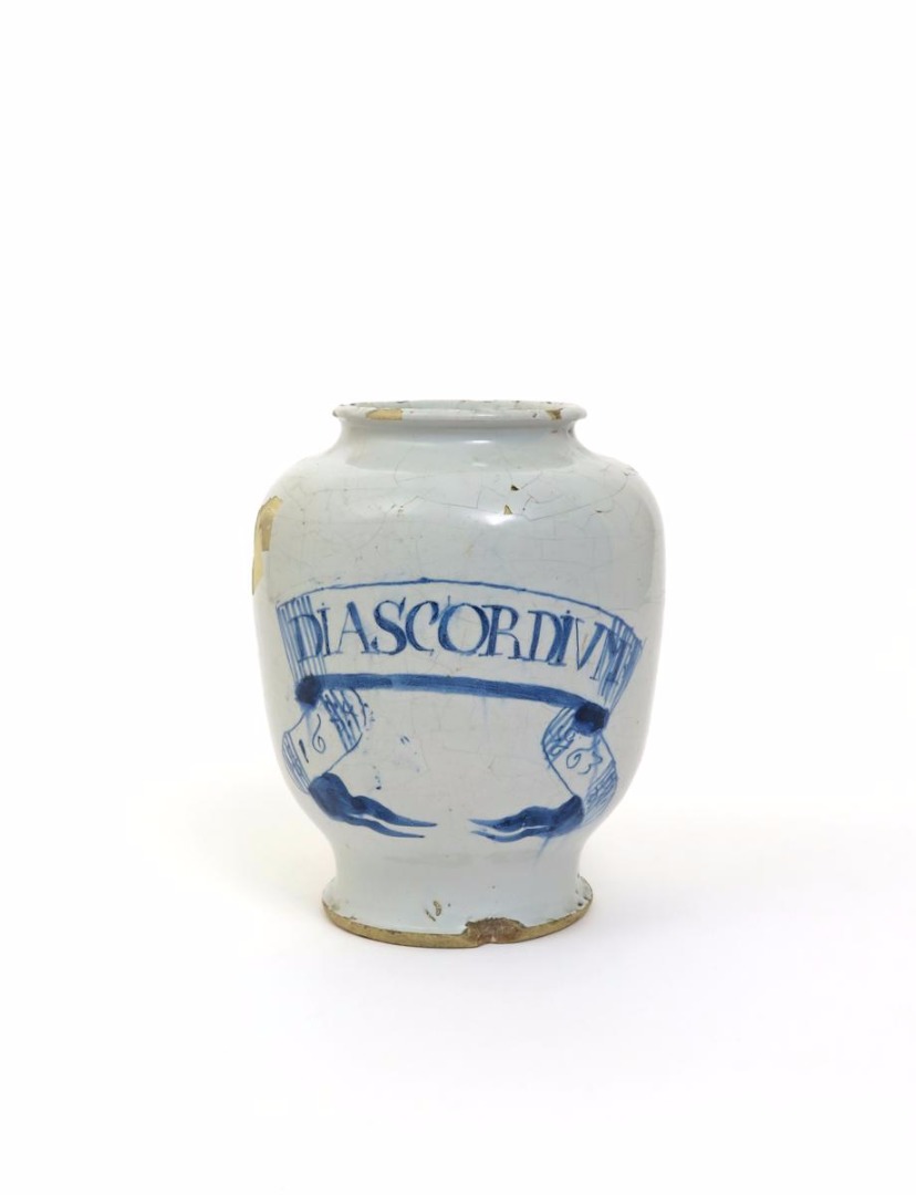 An early English delftware dry drug jar dated 1663, simply painted in blue with a ribboned banner bearing the inscription 'DIASCORDIUM' and the date 1663, a clean repair, some chipping, 20cm.