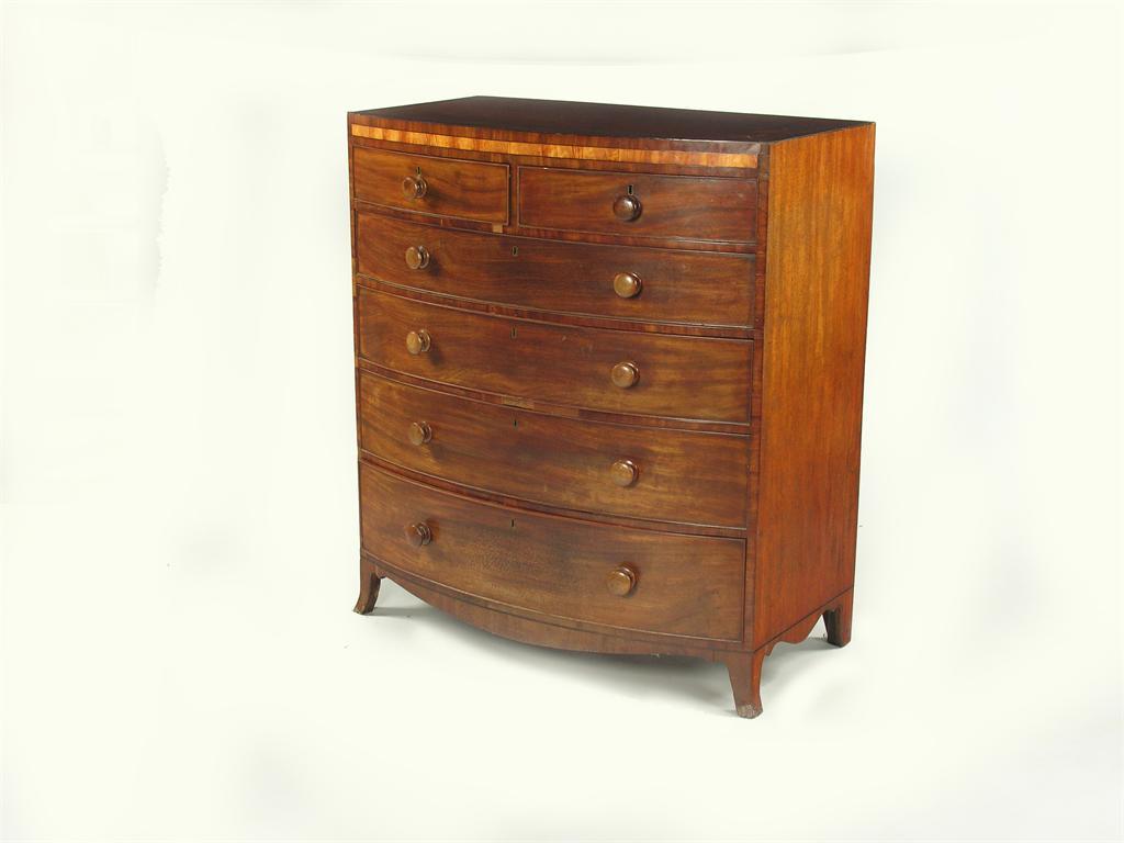 A George IV mahogany bowfront chest, the cross banded top with ebonised stringing to a satinwood banded frieze above two short and four long graduated drawers, 47.25in (120cm) h, 43.5in (110.5cm) w, 23.75in (60.2cm) d.
