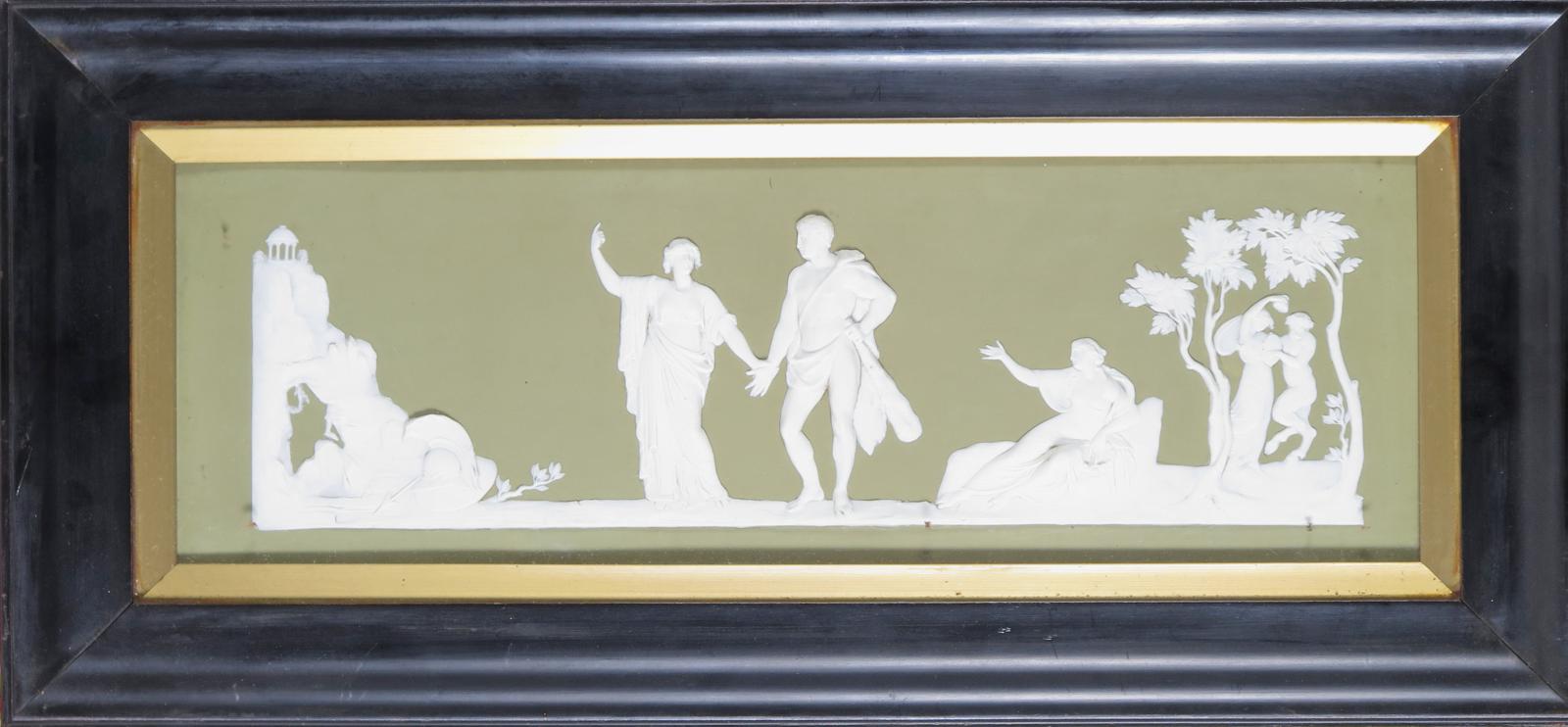 A large Wedgwood Jasperware rectangular plaque 19th century, depicting the Choice of Hercules, the hero standing with his wrist being held by Virtue trying to lead him away from Pleasure, who beckons him towards a nymph dancing with a drunken satyr, in white on an olive green ground, impressed mark, mounted in a glazed wooden frame, 26.8cm x 58cm overall.