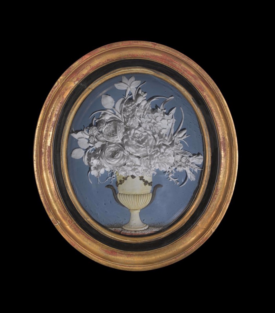 A fine pair of Derby biscuit porcelain oval plaques c.1820-30, modelled perhaps by James Goadsby each with a profusion of delicate white flowers and leaves issuing from cold-painted alabaster style urns, against a blue ground, mounted in giltwood frames behind domed glass, 38cm overall. (2)