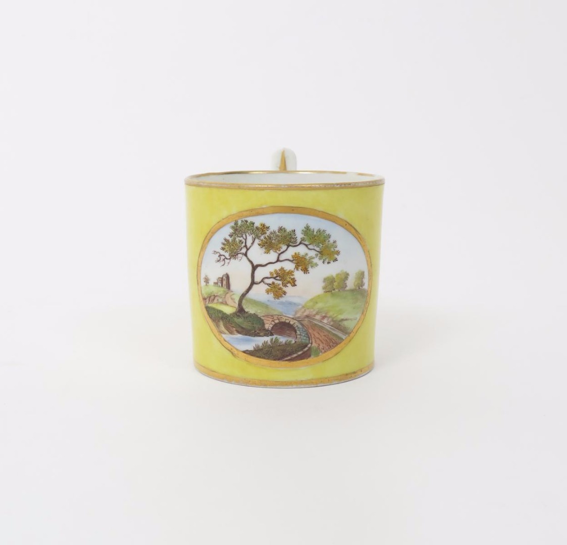 A Derby yellow ground coffee can c.1815, painted with an oval panel containing a landscape scene of a tree above a low bridge over a river, with tall wishbone handle, titled 'Near Madely, Shropshire' to the base, iron red factory mark, 7cm.