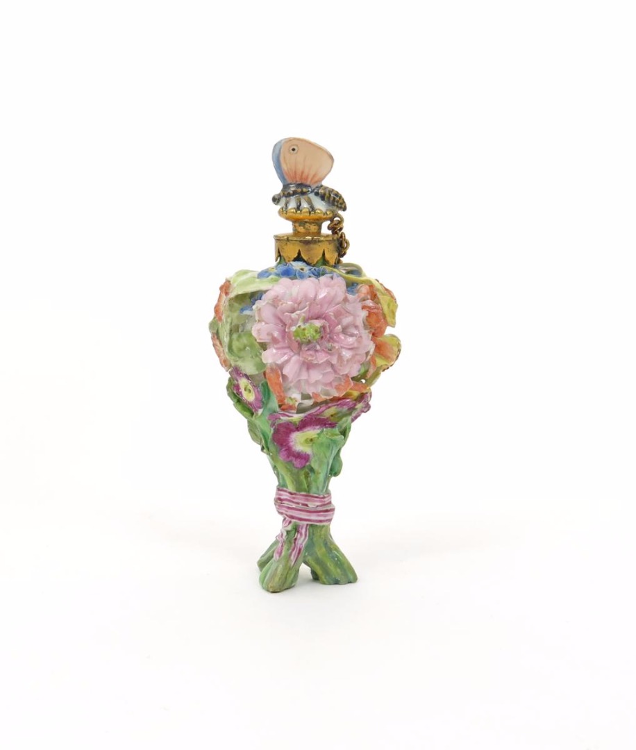 A Derby scent bottle c.1765, formed as a posy of flowers tied around the stems with a pink striped ribbon, with gilt metal mounts, the stopper formed as a butterfly, some damages, 9.5cm.