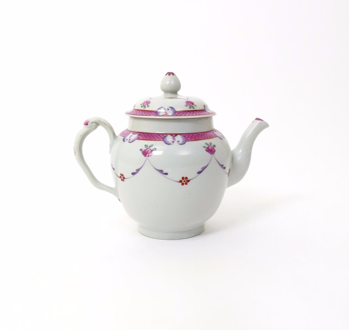 A New Hall teapot and cover c.1785-90, with a clip handle and short curved spout, simply decorated with delicate swags issuing from flowerheads beneath a pink scale border with purple C scroll motifs, some good restoration, 20cm. (2)