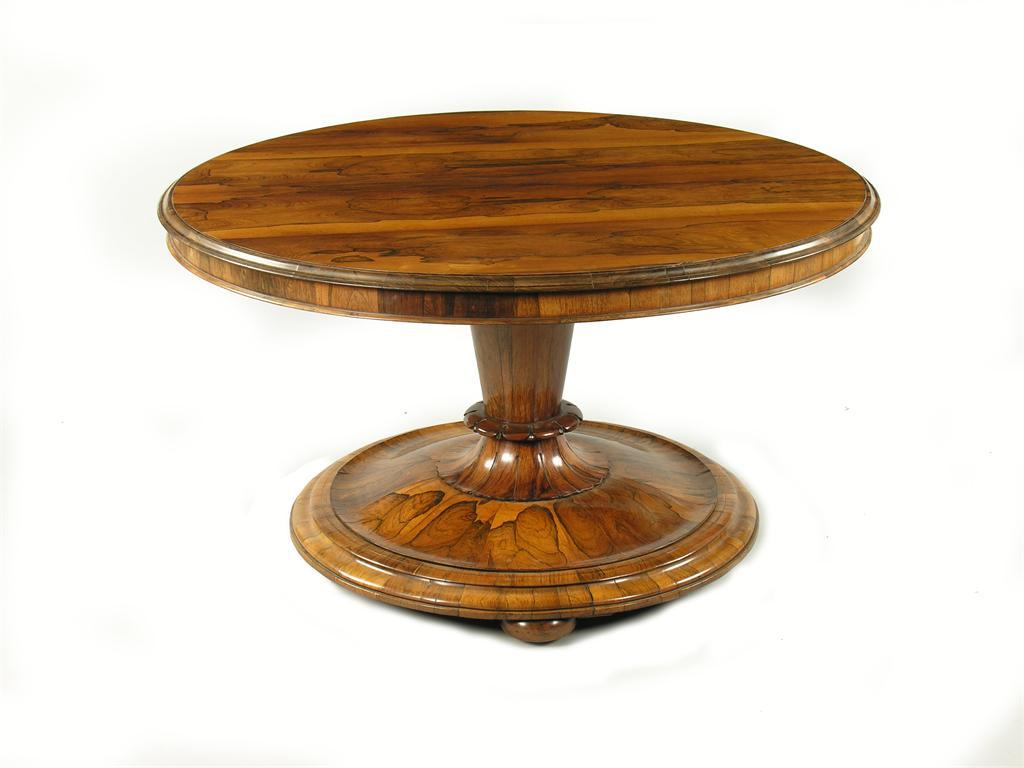 A George IV rosewood centre table, the moulded edge tilt-top on an inverted tapering stem to a petal carved collar, the domed platform base to three bun feet with sunken brass castors, 29in (73.5cm) h, 52in (132cm) dia.
