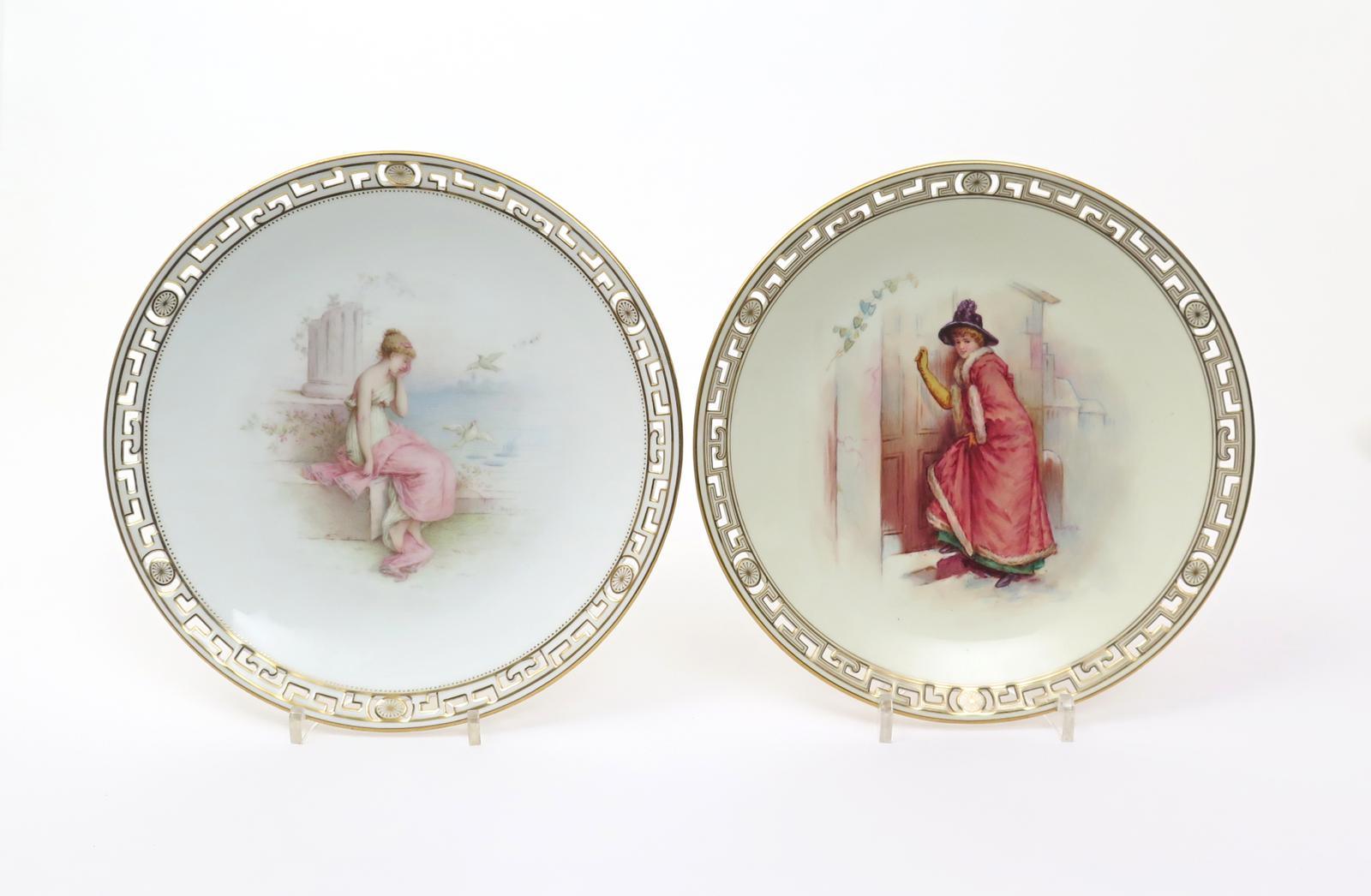 Two Minton cabinet plates c.1895-98, one painted by Antonin Boullemier with a Classical maiden seated by a ruined column and holding her face in her hand, doves in flight beside her, the other painted by John Currie with a girl wearing a long fur-lined coat and yellow gloves, knocking on a door, signed, within reticulated rims, printed and impressed marks, 24.2cm. (2)