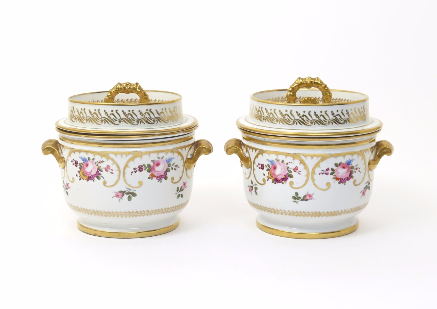 A pair of Chamberlain's Worcester ice pails with liners and covers c.1810-20, painted with polychrome arrangements of rose-centred flower sprays within gilt C scrolls on a white ground, printed marks to the inside of the covers, 22cm. (6)