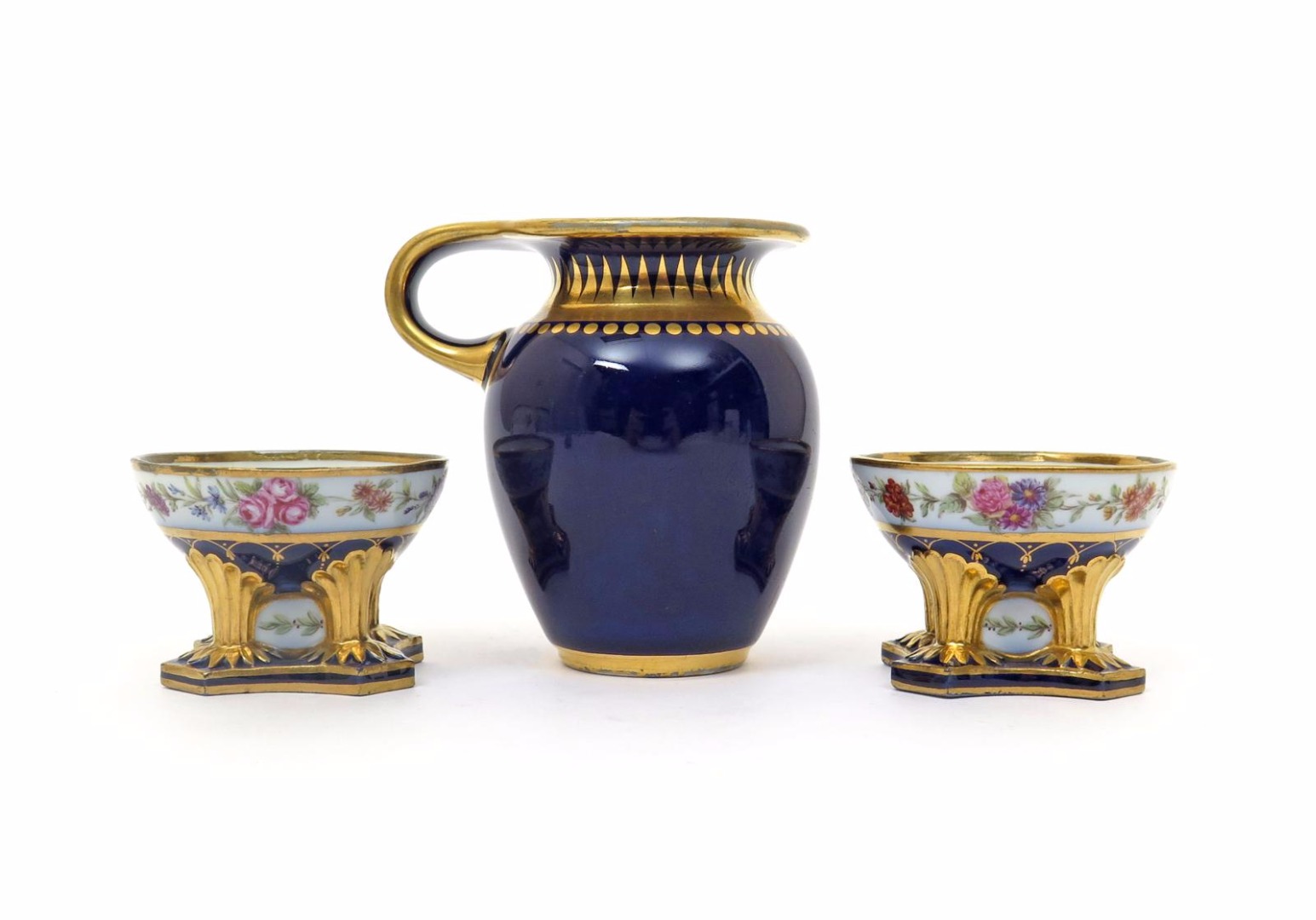A pair of Sèvres salts and a cream jug c.1810-20, the small circular salts raised on fluted gilt columns above a shaped base, the exterior rims painted with a continuous floral band, reserved on a blue ground, the jug of Etrusque à Bourrelet shape, simply decorated with a band of gilt dots and stylized stiff leaves, gilt and painted marks, 8.5cm max. (3)