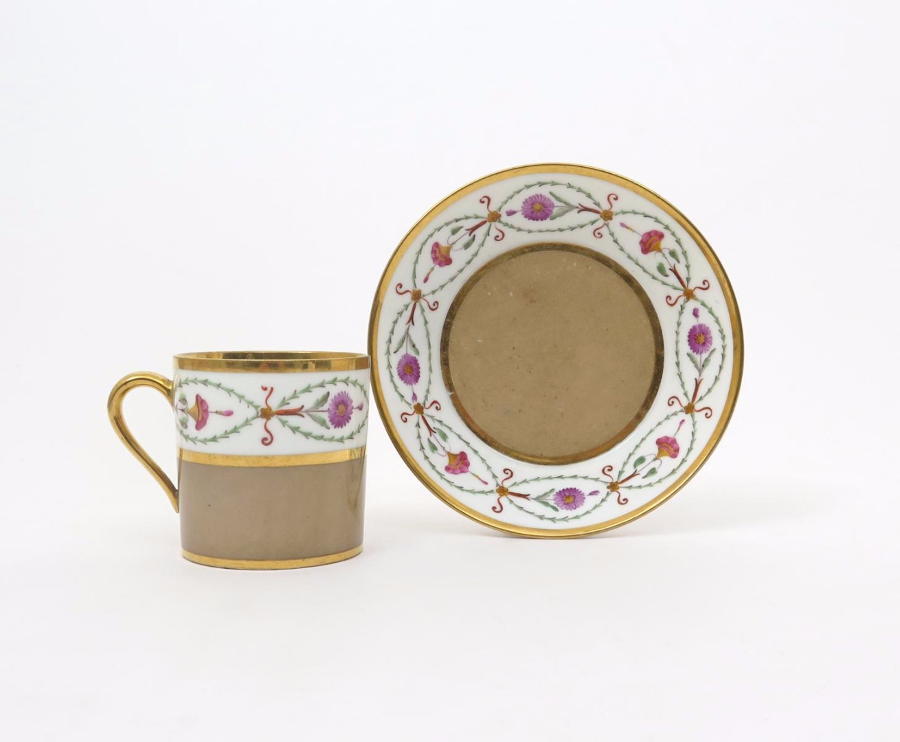 A Sèvres coffee can and saucer c.1805, painted with a formal band of convolvulus and chrysanthemum within leaf swags and scrolled motifs, reserved on a muddy café au lait ground, printed red and incised marks, 13.3cm. (2)