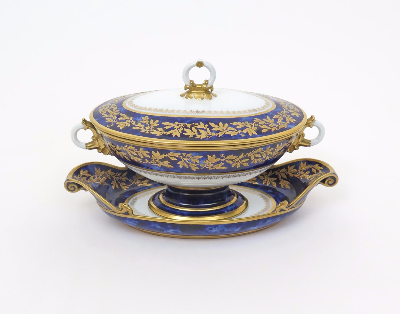 A Sèvres tureen with cover and stand date code for 1846, the oval forms decorated with a continuous foliate garland in raised gilt reserved on a marbled blue ground, green and gilt marks, 24.8cm. (3)