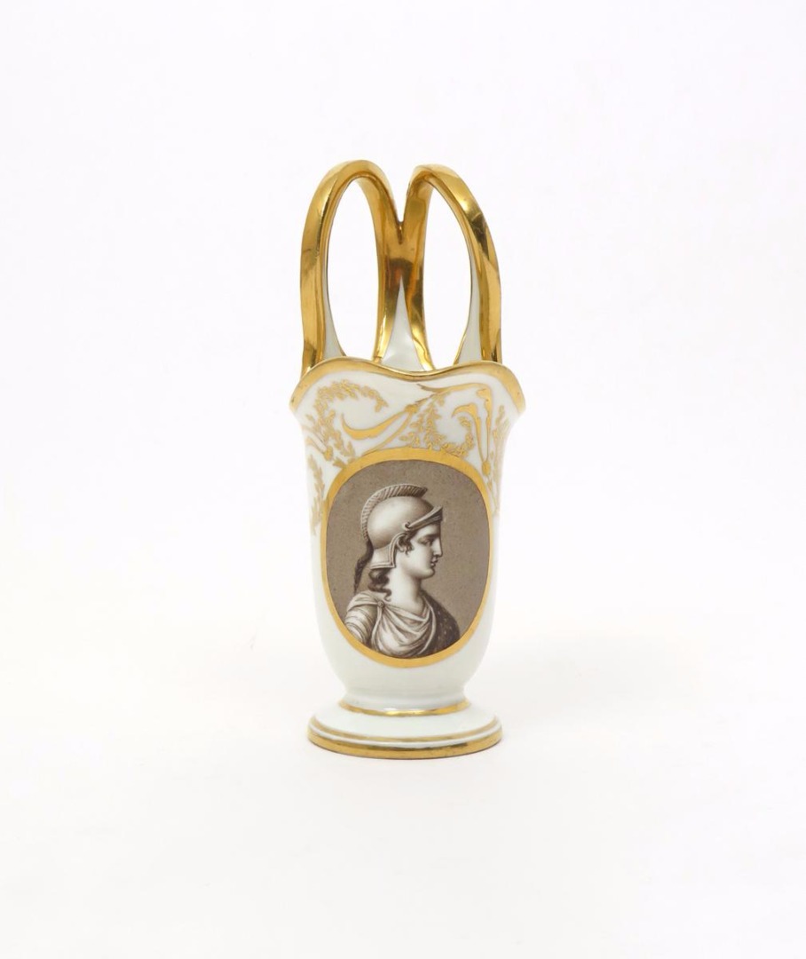 A Dagoty (Paris) porcelain jug c.1820, the tall helmet-shape with a tall double loop gilt handle, painted beneath the spout with the head and shoulders portrait of a female warrior in sepia monochrome, the rim with a scrolling gilt foliate motif, 18.5cm.
