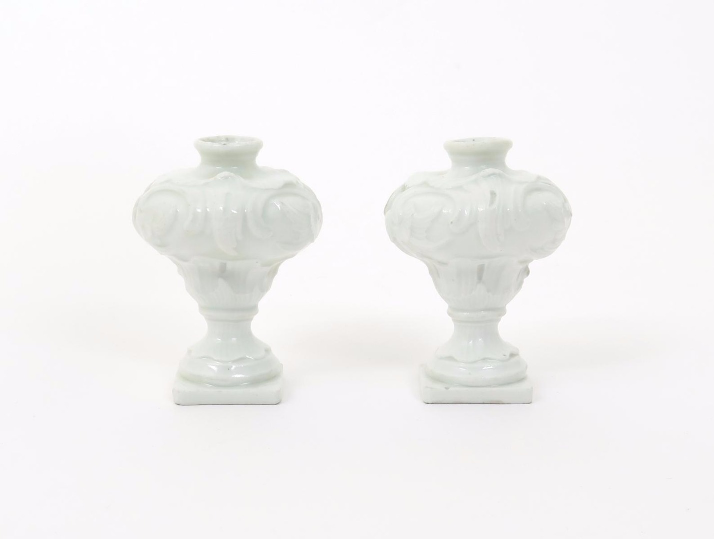 A pair of Continental porcelain miniature vases mid 18th century, probably Vienna, the wide-shouldered forms moulded with rococo scrolls and raised on square bases, minor faults, 7cm. (2)