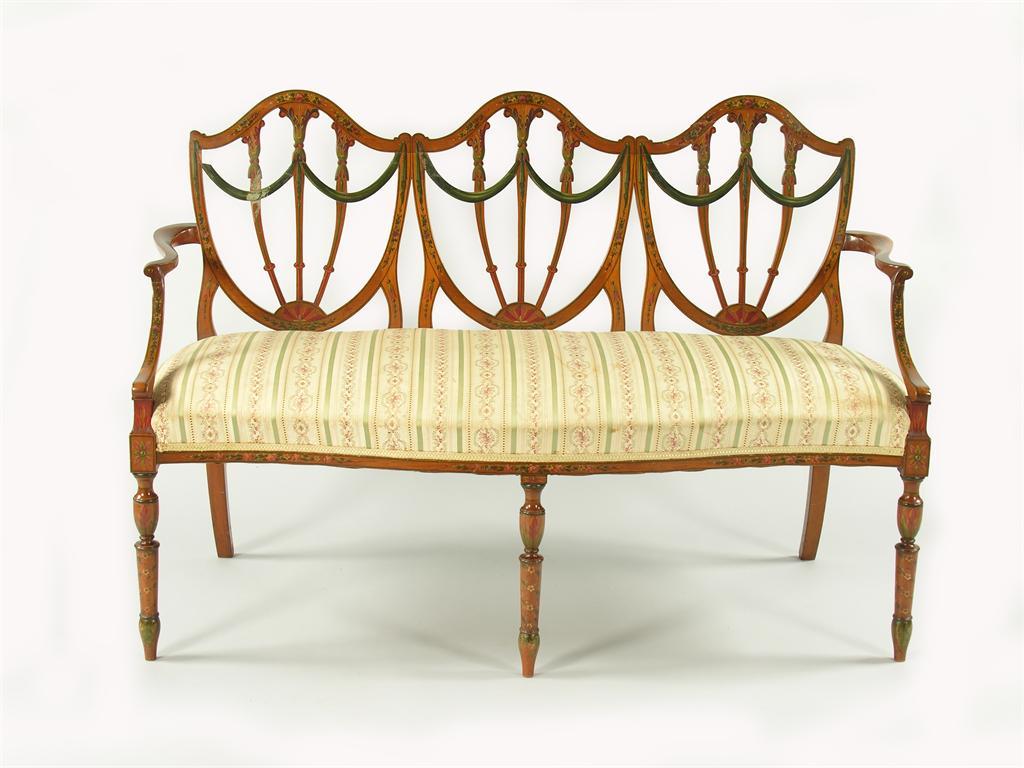 A late Victorian satinwood and polychrome decorated triple chair back settee