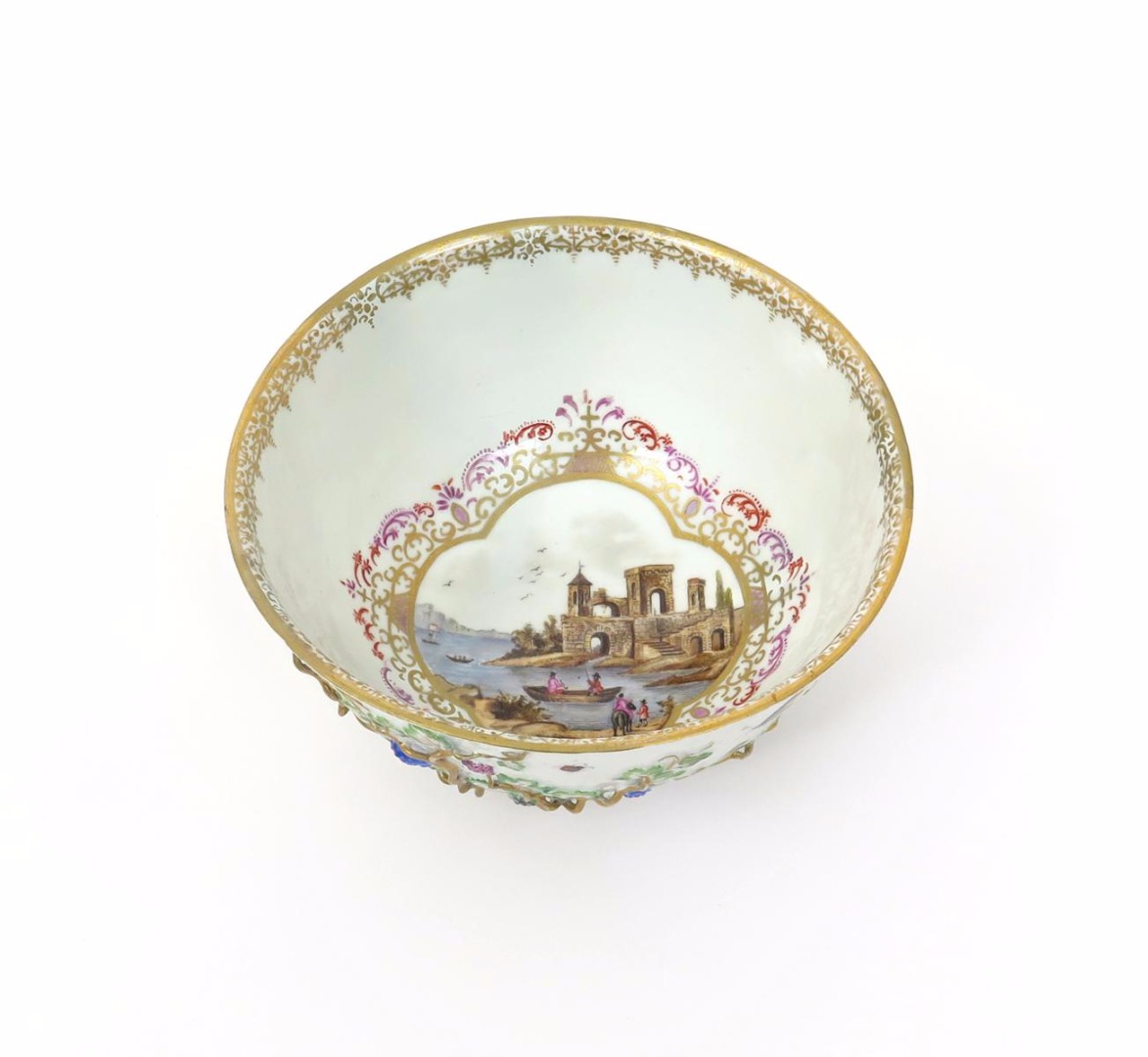 A Meissen bowl c.1745, painted to the interior with a scene of figures in boats at a quayside within a quatrefoil panel, the exterior applied with fruiting grapevine amidst painted insects, blue crossed swords mark, restored, some of the decoration perhaps later, 17.7cm dia.