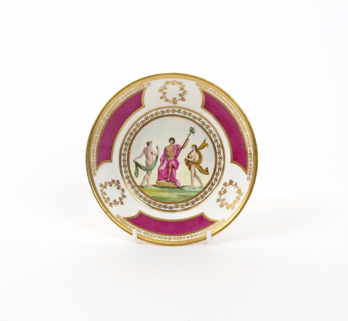 A Naples porcelain saucer late 18th century, the well painted with a Classical figure holding a long staff and wearing a magenta robe, attended by two maidens, the rim with claret ground panels between leaf garlands, crowned N mark in blue, 13.8cm.