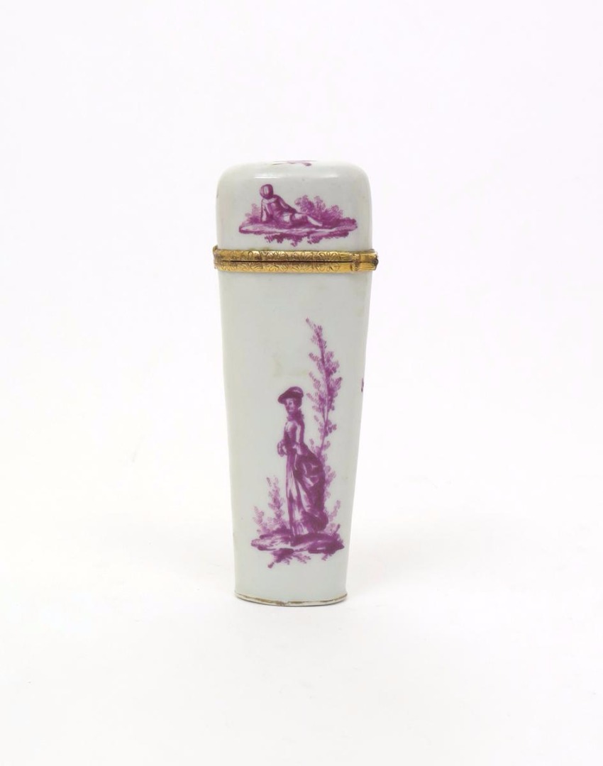 A Continental porcelain etui c.1765, the tapering form painted in purple monochrome, one side with a well-dressed lady before a tall tree, the reverse with a gentleman proferring his tricorn hat, similar small vignettes to the hinged cover, fitted with gilt metal mounts, the contents lacking, 11.1cm.