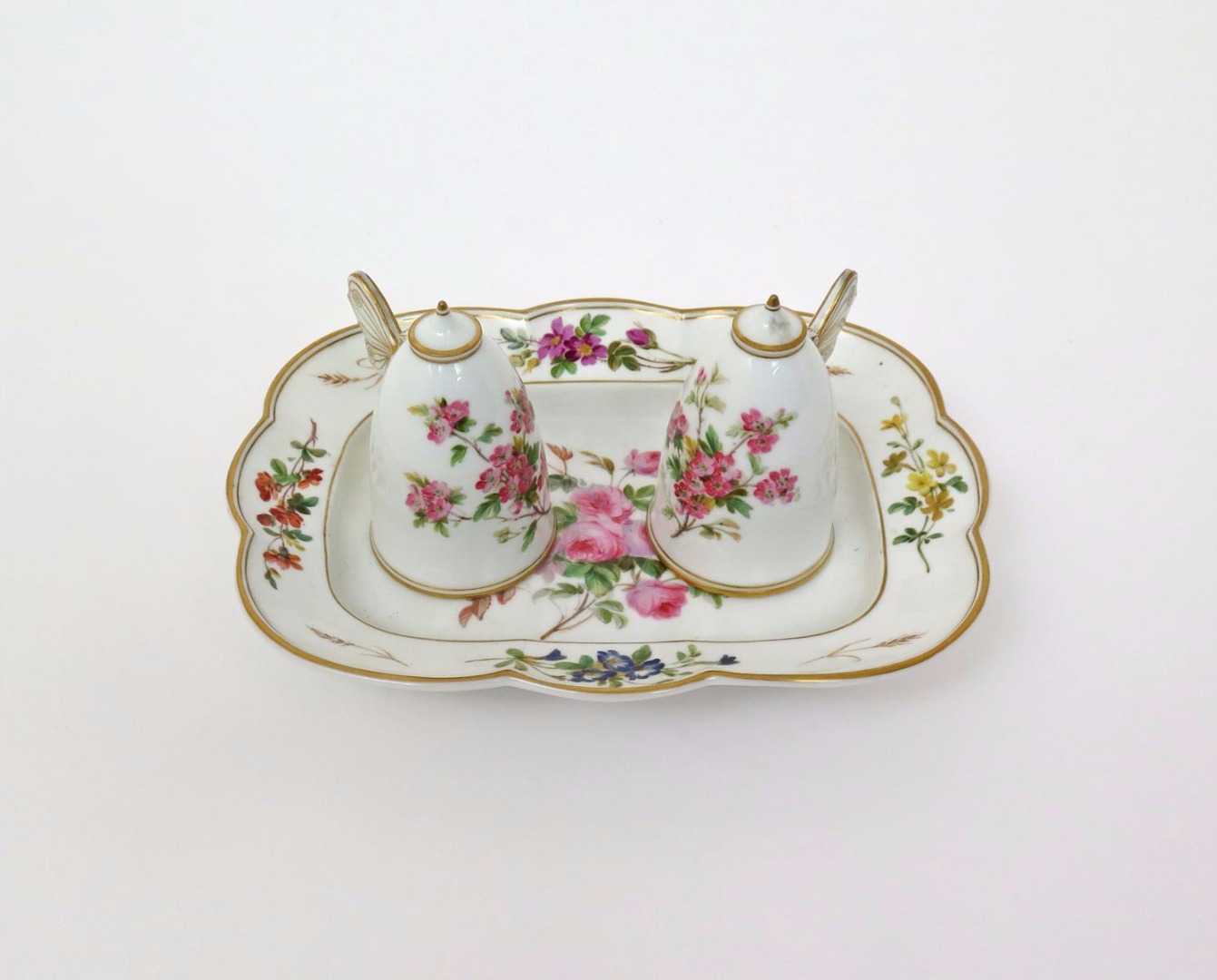 A rare Sèvres candle snuffer stand c.1855, the shaped rectangular tray painted with pink roses and other European flowers, the two snuffers formed as bee skeps with a butterfly forming the handle of each, similarly decorated with sprays of dog rose, printed marks, 16cm. (3)