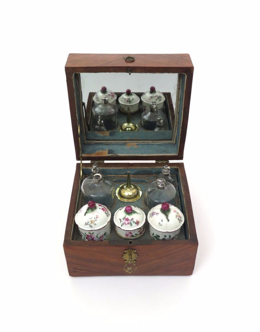 A French travelling toilet or dressing table set with Mennecy porcelain mid 18th century, the square box with a veneered marquetry design to the hinged lid, fitted with three Mennecy lobed cylindrical toilet pots and covers painted with flowers, four glass bottles with silver mounts and a silver gilt funnel, the lid's interior with a mirror, fitted with a lock and key, 19.5cm overall.