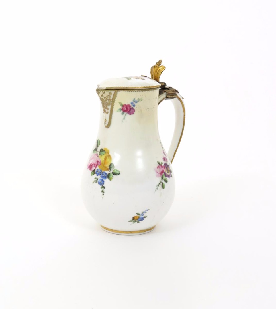 A Vincennes covered jug date code for 1753, painted by Barbet with sprays of pink and yellow roses amidst blue forget-me-nots, fitted with a gilt-metal mount to the hinged cover, blue interlaced LL mark and letter A code, painter's mark, damage and restoration, 18cm.