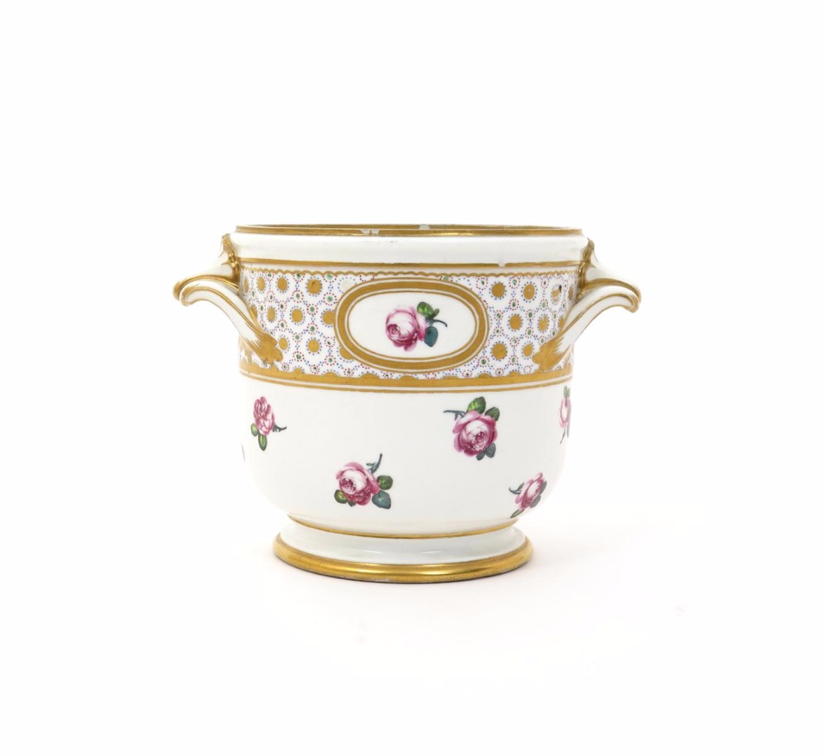 A Sèvres small seau à demi bouteille from the Pavlovsk Service c.1774, the U-shaped form with two scroll handles, painted with pink rose sprigs beneath a band of oval panels containing similar sprigs reserved on a oeil de perdrix ground, crowned interlaced LL mark, incised with the initials MG and AP, 11.5cm.