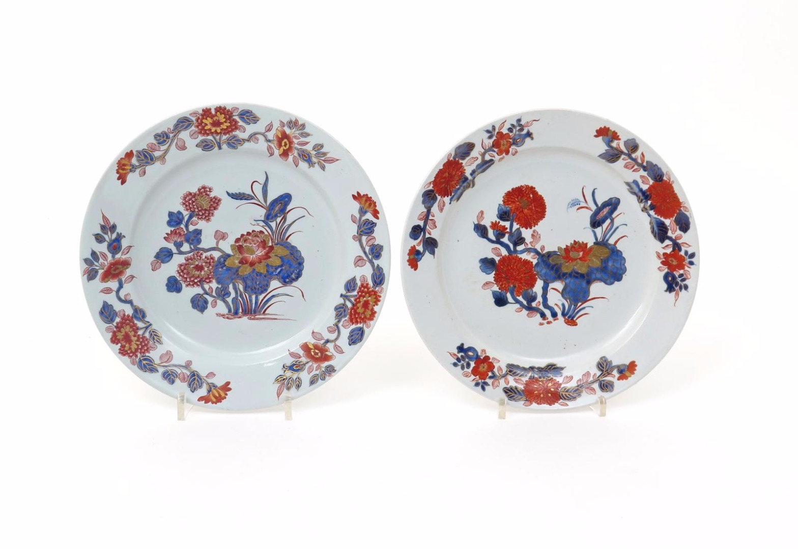 A close pair of Doccia plates c.1755-60, well decorated in the Imari palette with sprays of lotus and chrysanthemum to the wells, the rims each with three further sprays of Oriental flowers, 22.3cm. (2)