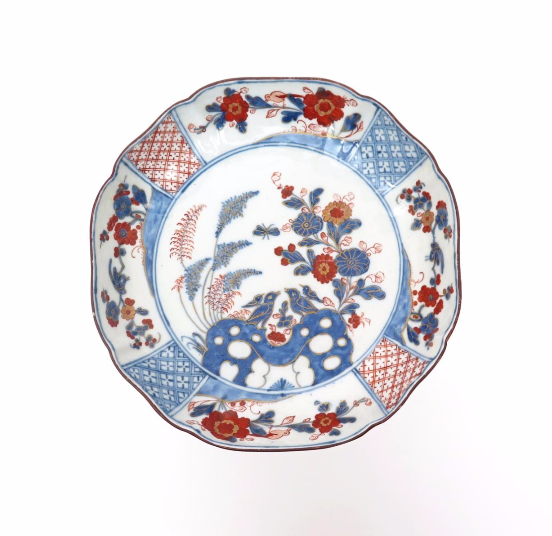 A Cozzi dish c.1760, painted in the Imari palette with a family of birds perched on holey rockwork between flowering branches and feathery stems, the shaped rim with four panels of birds perched on flower sprays alternating with narrow panels of hatched diaper in red and blue, red anchor mark, some rim faults, 22.2cm.