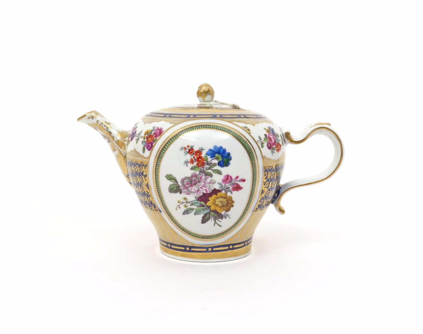 A Vienna teapot and cover c.1760, the inverted pear body painted in the Sèvres manner with a fine oval panel of flowers to two sides, reserved on a blue ground with gilt hatching beneath a continuous shaped floral garland border, blue shield mark and impressed i, some good restoration to the cover, 16.5cm. (2)