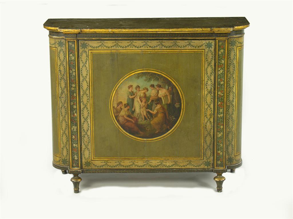 A 19th century painted commode, with gilt stringing, the inverted breakfront top with curved corners above a door centred a circular panel painted in the manner of Angelica Kauffman, enclosing a painted interior with shelf, on turned tapering feet, 39in (99cm) h, 47.25in (120cm) w, 17in (43cm) d.