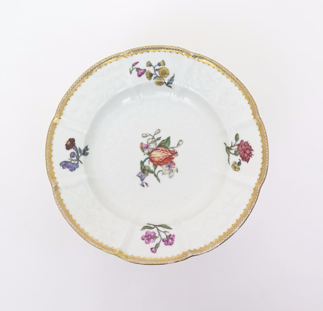 A Meissen plate mid 18th century, moulded with the Gotzkowsky relief of four floral panels to the rim and a continuous garland to the well, painted in the botanical manner with specimens including tulip, narcissus, carnation and convolvulus, the rim with a narrow hatched gilt border, blue crossed swords mark, 24cm.