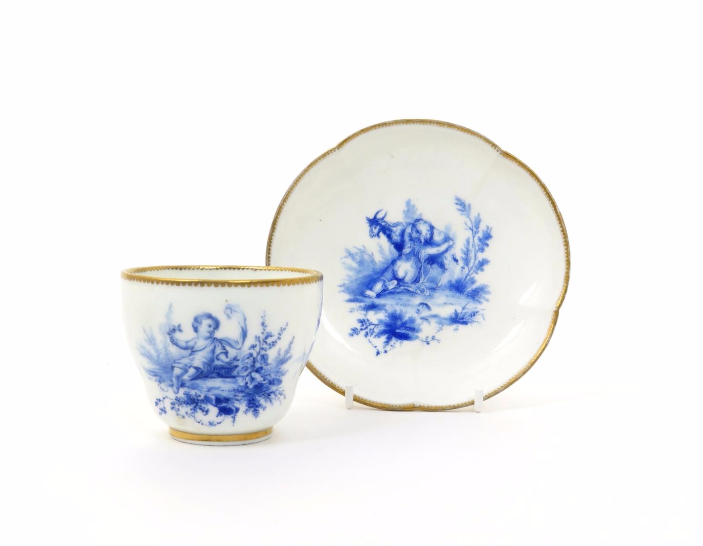 A Vincennes cup and saucer c.1754, painted in blue, the cup with a putto seated on the ground beside a basket of flowers, the cinquefoil saucer with a further putto seated beside a goat, gilt dentil rims, blue interlaced LL marks and painter's mark for Viellard, 13.8cm. (2)