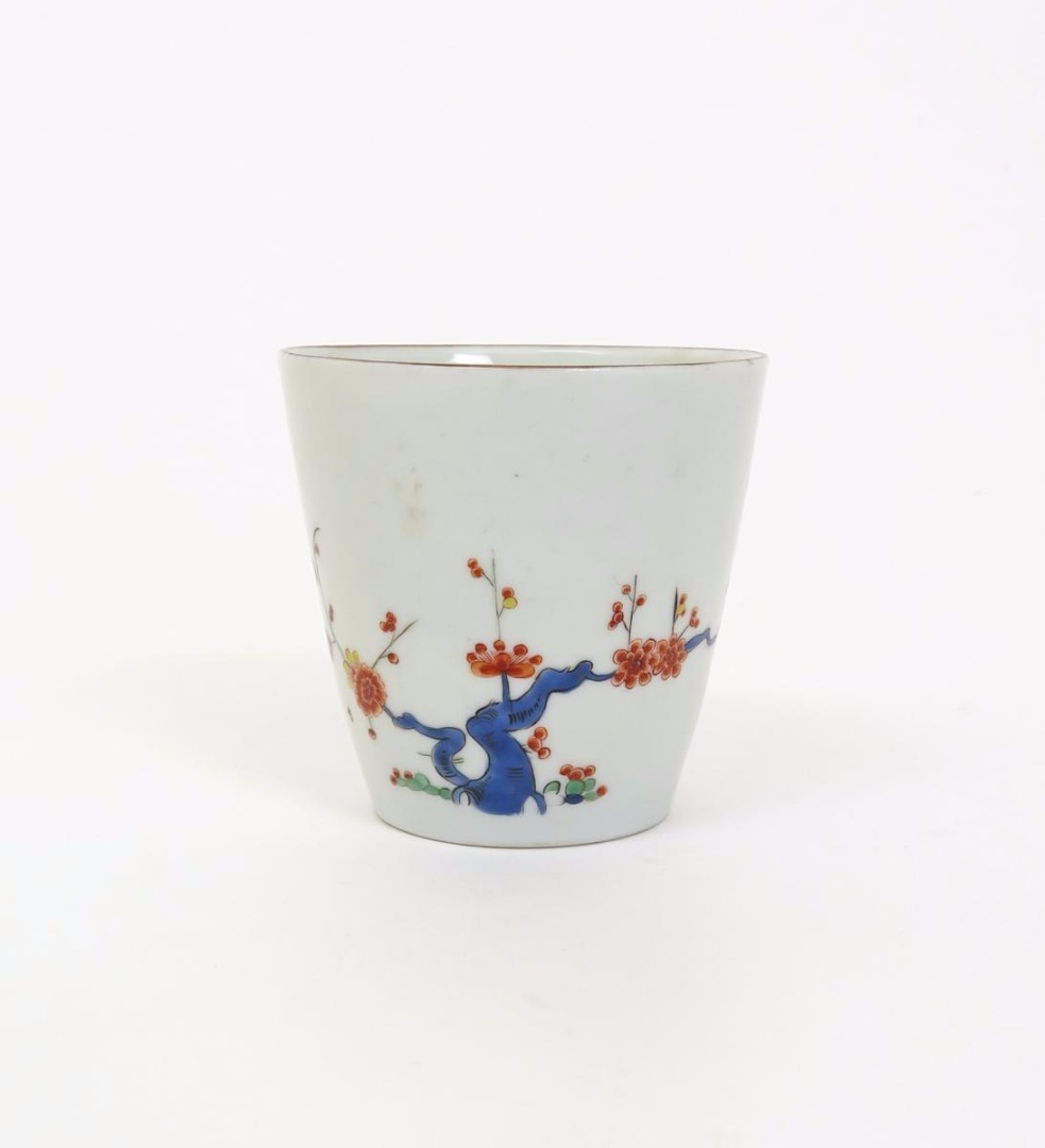 A Meissen beaker c.1730, the flared straight sides painted in the Kakiemon palette with a gnarled spray of prunus, the reverse with a single bird in flight, brown line rim, caduceus mark in underglaze blue, 7.5cm.