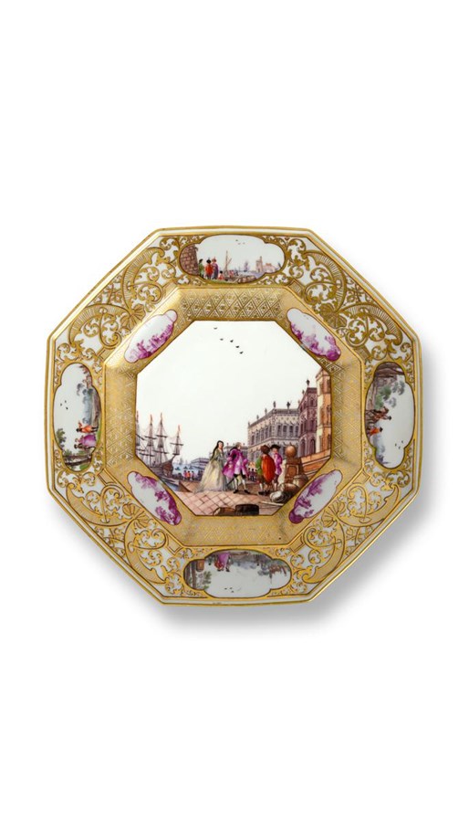 A fine Meissen octagonal plate from the Christie-Miller service c.1740, the well finely painted with a scene of figures standing at the quayside before an Italian palace, a ship being loaded behind, the cavetto with four shaped panels of figures in landscapes in purpurmalerei reserved on a gilt diaper band, the wide rim with similar scenes in polychrome enamels reserved in quatrefoil panels on a wide scrolling foliate gilt and black border, blue crossed swords mark, 24cm.