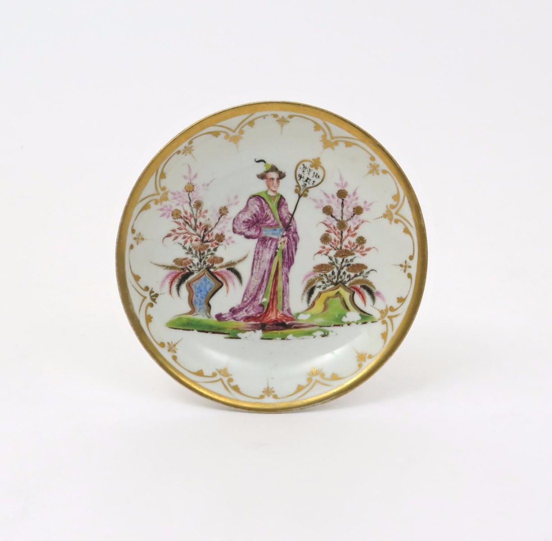 A Meissen Böttger porcelain saucer c.1722, hausmaler decorated with a single standing chinoiserie figure holding a shaped fan bearing pseudo Chinese characters, between finely painted plants issuing from colourful rockwork, the rim with a simple formal gilt design, some enamel wear, 12.3cm.