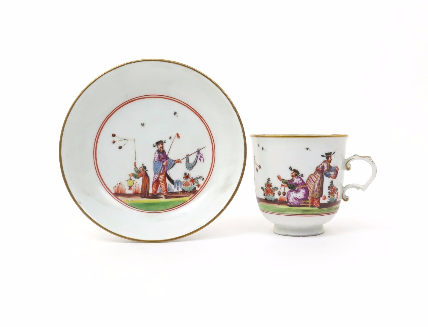 A good Meissen coffee cup and saucer c.1735, painted with chinoiserie scenes of figures being pestered by flying insects, holding fly whisks, incense burners and fans, the cup with a delicately scrolled handle, blue crossed swords mark, Dreher's mark to the saucer's footrim, 13cm. (2)