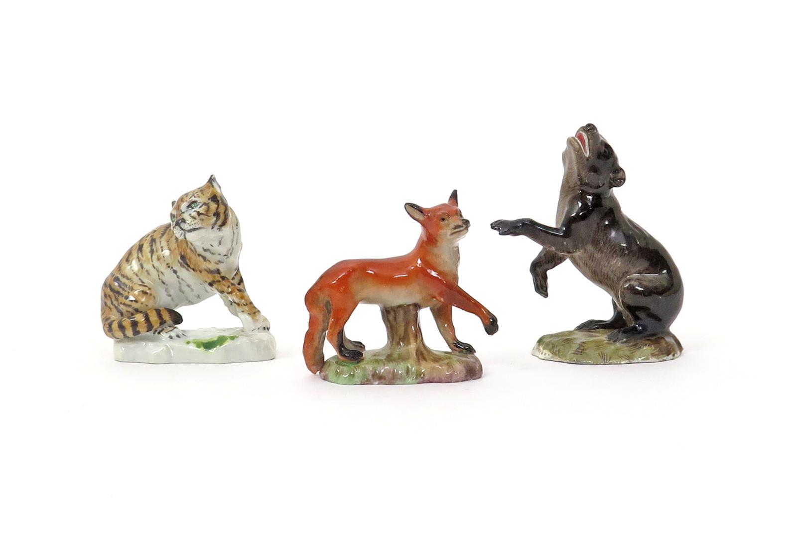 Three miniature Meissen models of animals 20th century, one of a bear cub raised up on its haunches with teeth bared, one of a fox with right forepaw raised and head turned to dexter, the last of a tiger or lynx seated on its haunches and turning its head over its right shoulder, blue crossed swords marks, some damages and restoration, 8cm high max. (3)