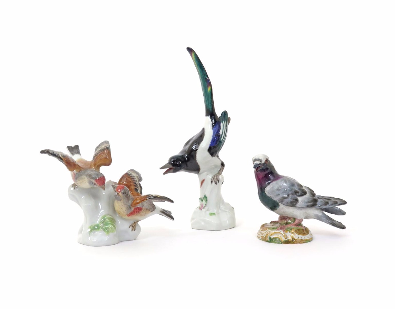 Three Meissen bird groups 20th century, comprising a pair of finches perched on a low stump with wings outstretched, a dove or pigeon with beak agape and naturally coloured plumage, and a magpie with tail erect and beak agape, blue crossed swords marks, minor damages, 20cm max. (3)